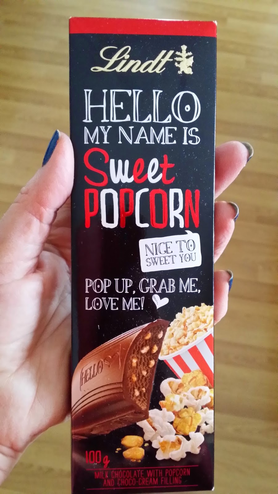 Lindt Hello my name is sweet popcorn, jag har fuskat och ätit några bitar och jag fick verkligen anstränga mej för att inte smacka i mej hela. Innehåller kornextrakt...jaja