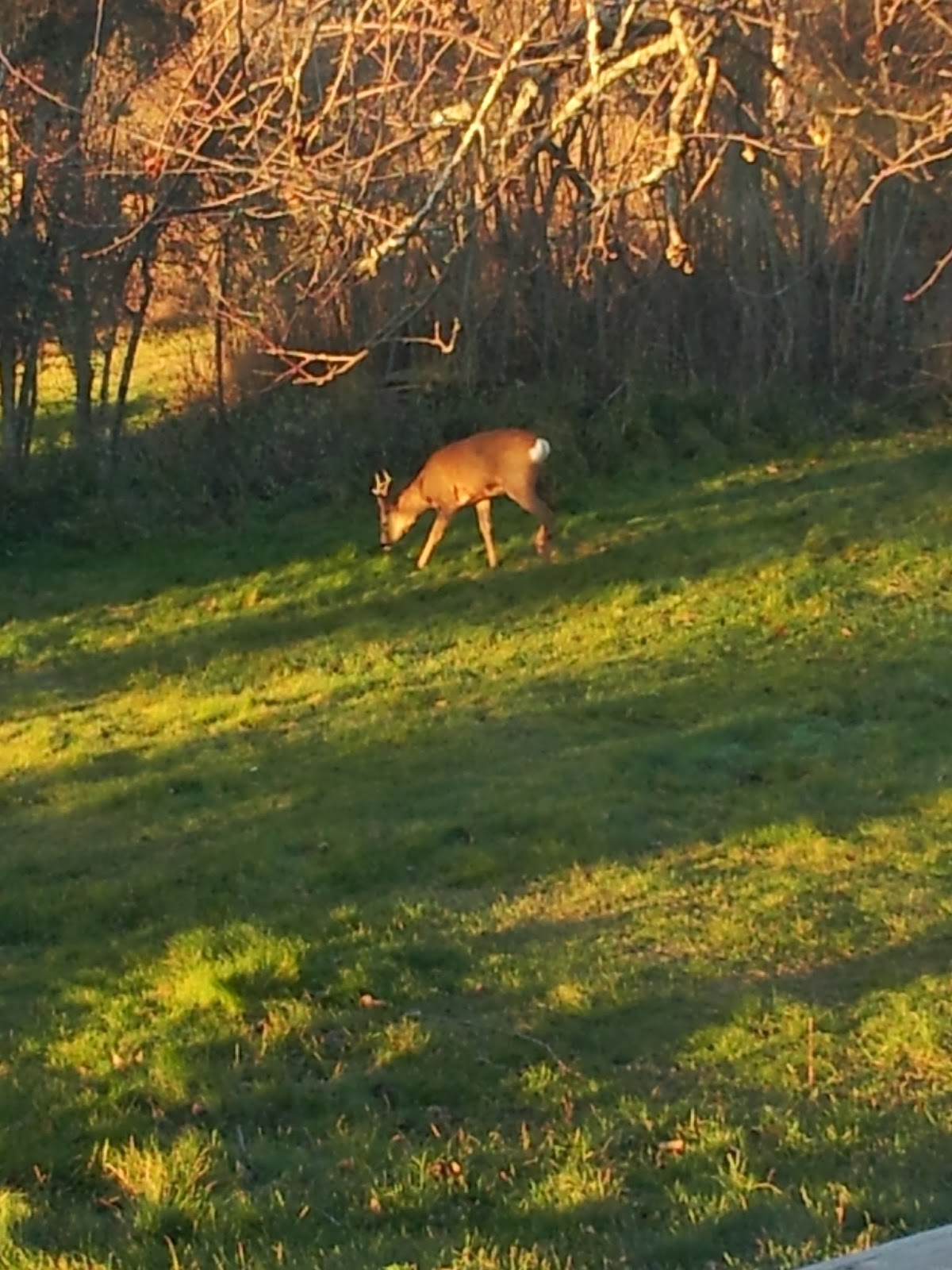 Jag ser varje dag rådjur,mina två katter och mina 23 höns, ibland hoppar nån hare förbi och ibland ett gäng vildsvin, likaså kronhjortar.Igår jagade Ozzie en hackspett(han fick den inte) Ser inte så ofta älg men det händer. Djuren jag gillar minst i min trädgård är, skator,möss och huggormar.